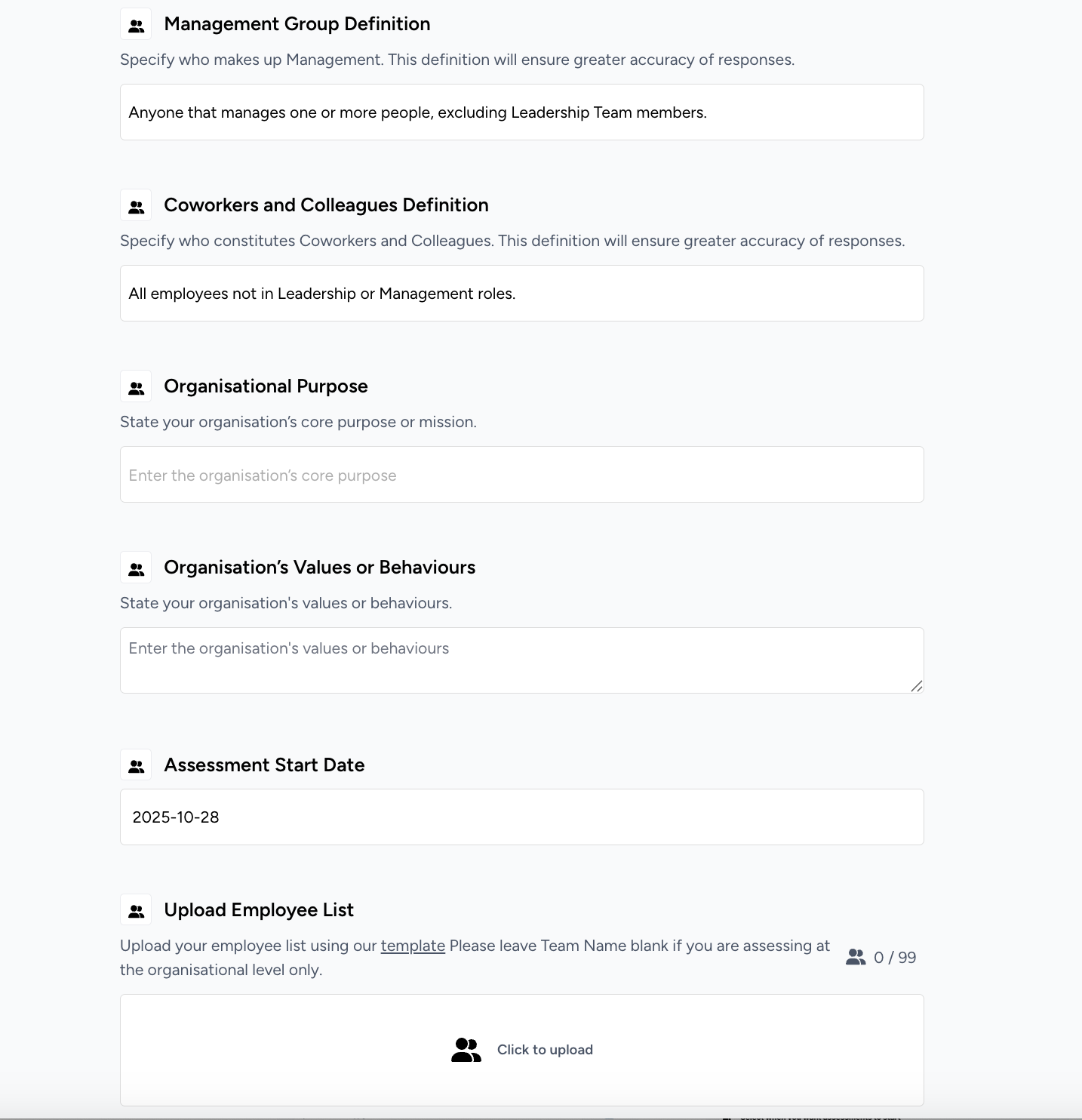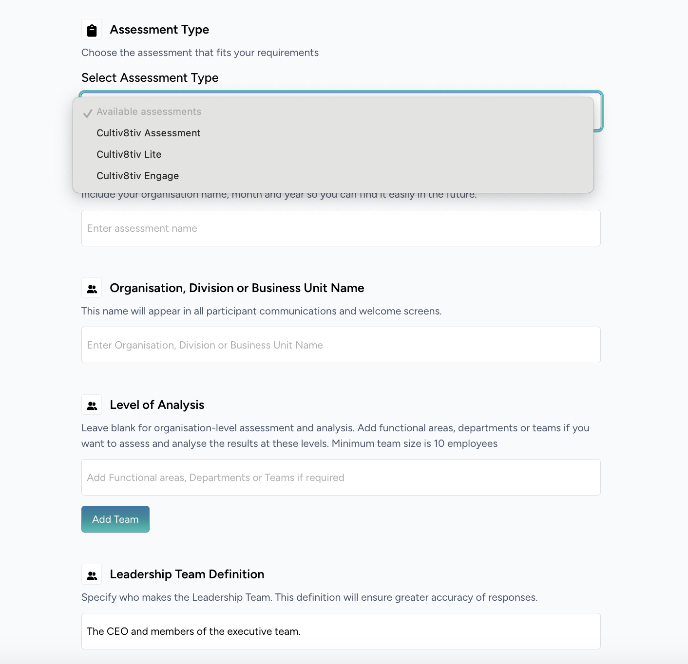 • Choose how you want to analyse your results by adding teams, divisions or areas